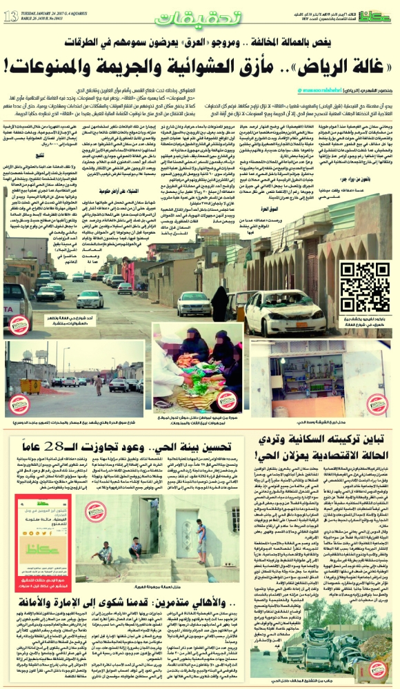 وكانت «عكاظ» نشرت تحقيقا موسعا حول العشوائية الطاغية على حي الفيصلية (الغالة) في قلب العاصمة الرياض، والتجاوزات التي تحدث فيه، وانتشار المساكن العشوائية والآيلة للسقوط، وبيع الممنوعات، ومطالب المواطنين فيه الجهات المختصة بضبط الأمور، ووضع حد للتجاوزات.