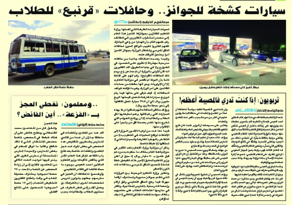 تلقت «عكاظ» تعقيبا من شركة تطوير لخدمات النقل التعليمي حول ما نشرته بعنوان «سيارات كشخة للجوائز.. وحافلات قرنبع للطلاب» في (17/5/1438)، موضحة أنها شركة حكومية تمثل الذراع التنفيذية لوزارة التعليم لتطوير قطاع النقل التعليمي والمسؤولة عن إدارته والارتقاء بجودة الخدمة المقدمة، مشيرة إلى أنها تقدم الخدمة حاليا لأكثر من مليون ومئتي ألف طالب وطالبة عبر أسطول مكون من 25 ألف حافلة ومركبة لخدمة 13 ألف مدرسة في مختلف المناطق والمحافظات والقرى والهجر.