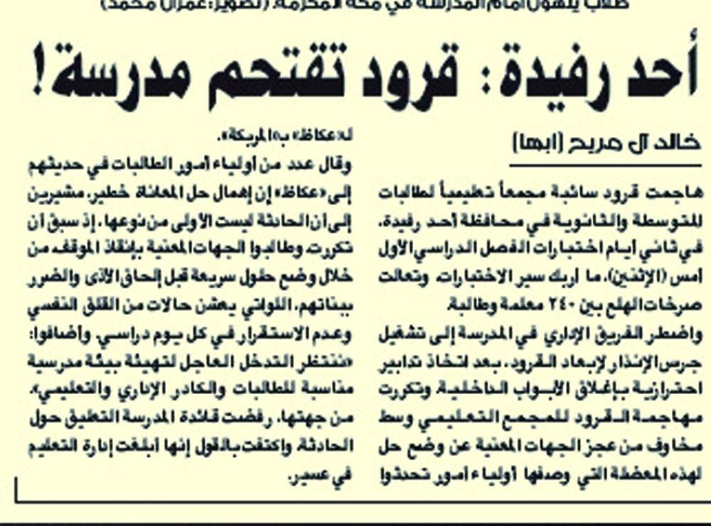 وكانت «عكاظ» نشرت خبرا حول مهاجمة قرود سائبة مجمعا تعليميا لطالبات المتوسطة والثانوية في محافظة أحد رفيدة، في ثاني أيام اختبارات الفصل الدراسي الأول ما أربك سير الاختبارات، وتعالت صرخات الهلع بين 240 معلمة وطالبة.