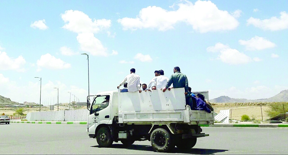 تخالف بلدية محافظة أحد رفيدة أنظمة المرور، بنقلها عمالها على متن مركبة مكشوفة، معرضة إياهم والآخرين للخطر، وانتقد عابرو طريق الملك خالد الحيوي تهاون البلدية، مطالبين بتدارك الأمر، ونقلهم في حافلات آمنة، بدلا من الشاحنات المكشوفة. (تصوير: خالد آل مريح