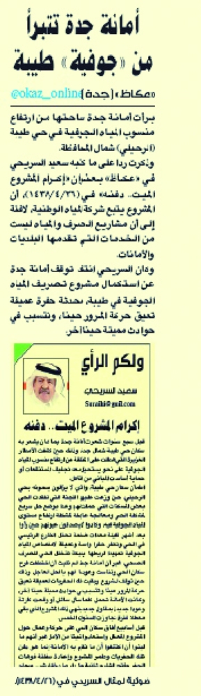 وكانت «عكاظ» نشرت تبرؤ أمانة جدة من تدفق المياه الجوفية في حي طيبة.
