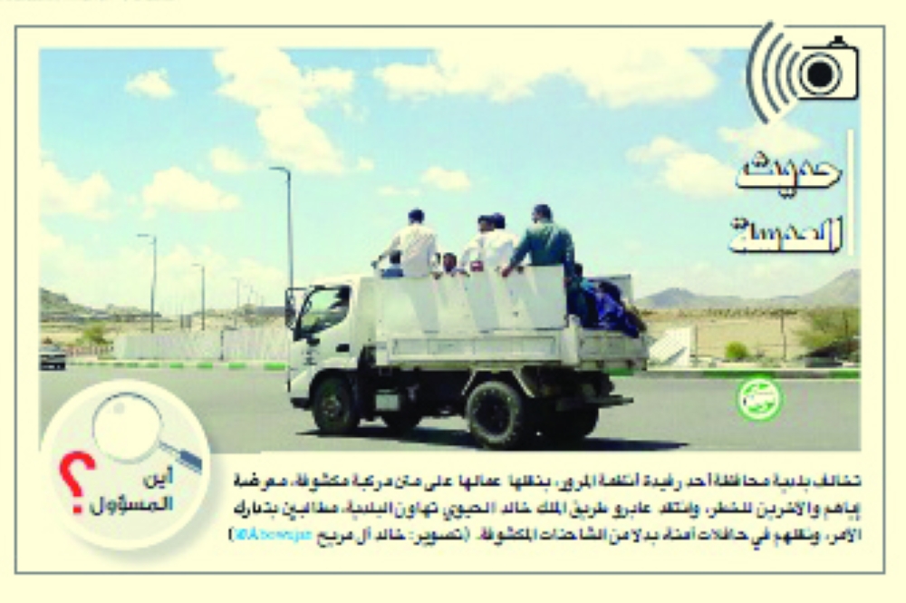 وكانت «عكاظ» نشرت صورة في زاوية حديث العدسة توضح نقل عمال بلدية أحد رفيدة في مركبة مكشوفة بطريقة مخالفة لأنظمة المرور، معرضة إياهم للخطر.