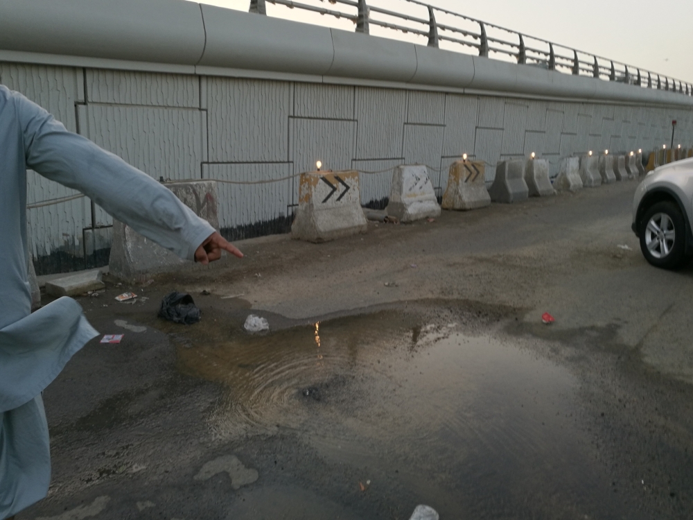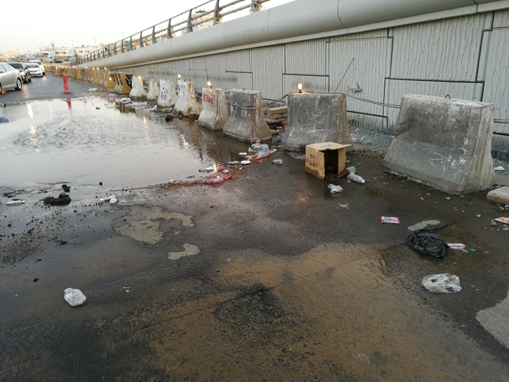 تحطمت أنابيب شبكة المياه في شارع المكرونة تحت مشروع جسر مطار الملك عبدالعزيز (شمال جدة)، وغمرت المنطقة بالمستنقعات التي تصدر للأهالي الحشرات والروائح الكريهة، فضلا عن دورها في تآكل الطبقة الأسفلتية، وتأثيرها على أساسات الجسر.
