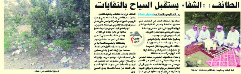 وأفادت الأمانة، تعقيبا على ما نشرته «عكاظ» بعنوان «الشفا يستقبل السياح بالنفايات» في 18/8/1438، بأنها وضعت خطة عمل مكثفة للمرحلة القادمة سيكون لها أثرها في تعزيز مستوى النظافة والإصحاح البيئي والعمل البلدي بأنحاء الطائف. وكانت «عكاظ» نشرت شكاوى عدد من الزوار والسياح في الطائف من تدني مستوى النظافة في الشفا، مستغربين الإهمال الذي يعانيه المتنزه العريق الذي اشتهر بطبيعته الخلابة.