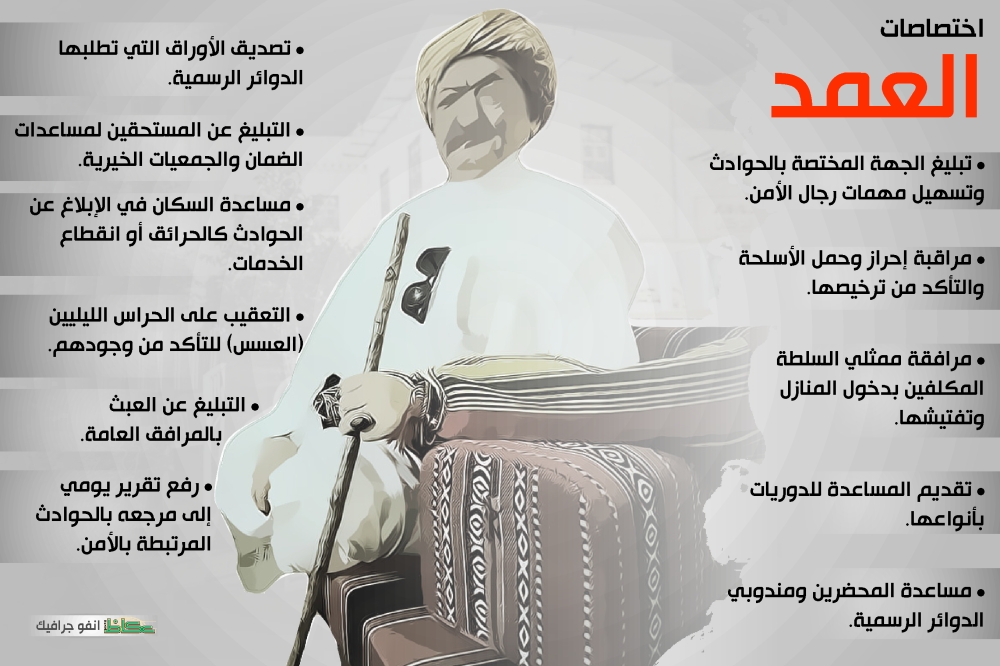 هـ وعند التأمل لاختصاصات العُمد ونوابهم في المادة السابعة نجد أنها لا تخرج عن 12 اختصاصا هي:
