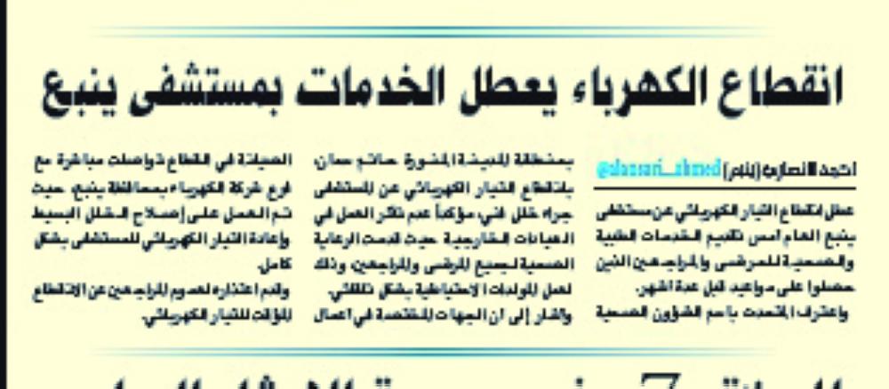 «الكهرباء»: عطل فني قطع التيار عن مستشفى ينبع
