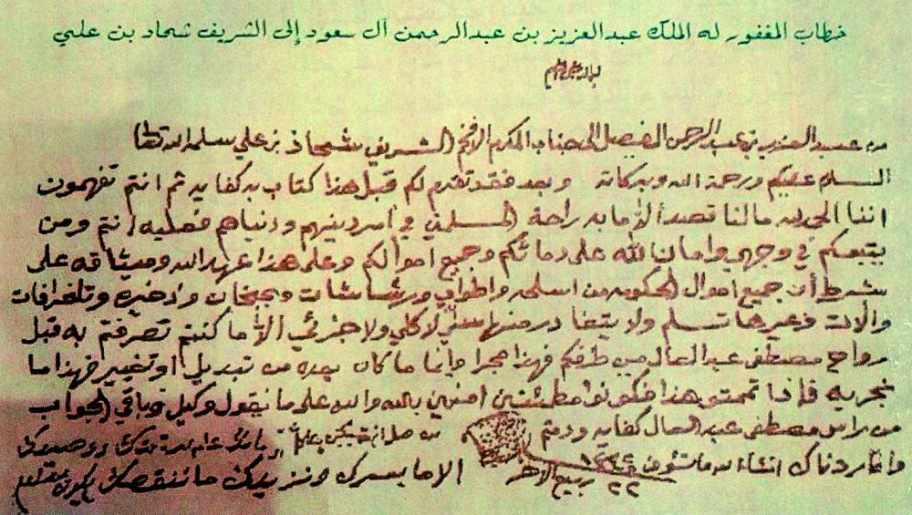 خطاب الملك عبدالعزيز إلى الشريف شحات بن علي