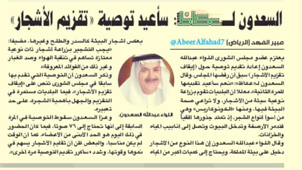 وكانت «عكاظ» نشرت تحرك عضو مجلس الشورى اللواء عبدالله السعدون لإعادة تقديم توصية حول إيقاف تقزيم الأشجار، سبق أن رفضها المجلس.