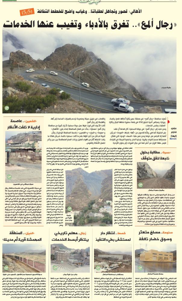 وكانت «عكاظ» نقلت في جولتها على محافظة رجال ألمع شكاوى الأهالي من تدني مستوى الخدمات البلدية، وذكر الأهالي أن المشاريع التنموية في ألمع لا تواكب الطفرة الثقافية والأدبية فيها.