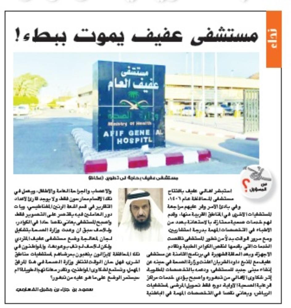 وكان المواطن سعود القسامي كتب في صفحة صوت المواطن مقالا انتقد فيه تدني مستوى الخدمات الطبية المقدمة في مستشفى عفيف، لافتا إلى أن الصرح الطبي تدهور بمرور الأيام، مناشدا وزارة الصحة بالتدخل وإنقاذه.