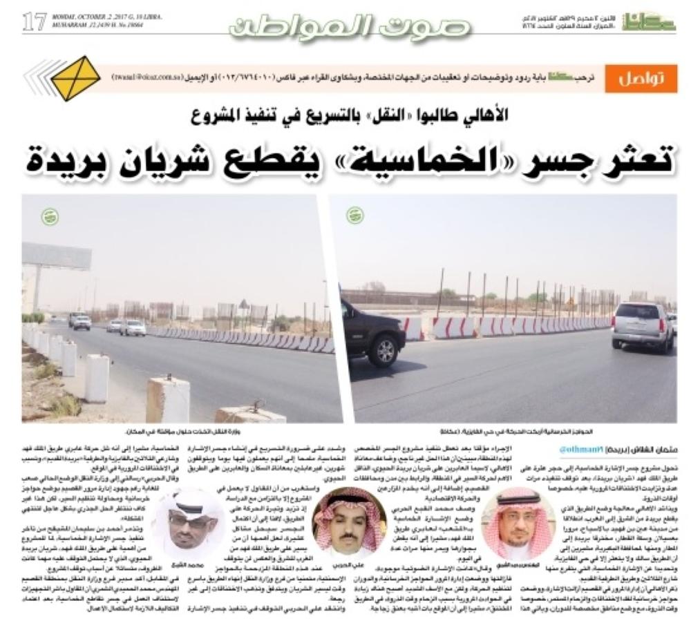 وأوضح الفرع ردا على ما نشرته «عكاظ» بعنوان «تعثر جسر الخماسية يقطع شريان بريدة» في (12/1/1439) أن تقاطع جسر الخماسية كان ضمن أعمال مشروع إنشاء الممر السفلي (نفق طريق الملك عبدالله).