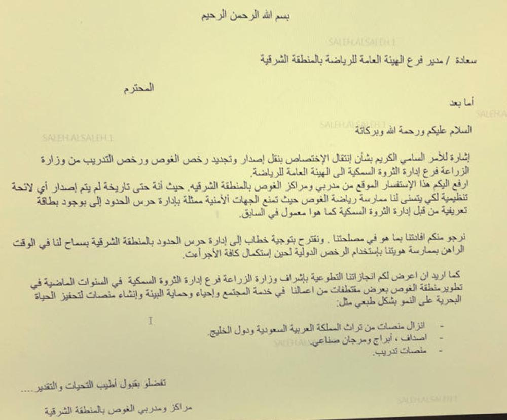 وذكروا في خطاب بعثوا به إلى مدير فرع الهيئة العامة للرياضة بالمنطقة الشرقية، أن الهيئة لم تصدر أي لائحة تنظيمية لكي يتنسى للغواصين ممارسة رياضة الغوص، مشيرين إلى أن الجهات الأمنية ممثلة بإدارة حرس الحدود تمنع السماح لهم بممارسة الرياضة دون وجود بطاقة تعريفية من قبل وكالة الثروة السمكية كما هو معمول في السابق.