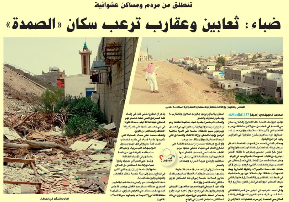 وذكرت البلدية تعقيبا على ما نشرته «عكاظ» بعنوان «ضباء: ثعابين وعقارب ترعب سكان الصمدة» في (17/ 9/ 1438) أن النفايات المنتشرة خلف محلات الجوالات عبارة عن مخلفات ترميم في محل تجاري، لافتة إلى أنه جرى التعامل مع المخالف وفق الأنظمة والتعليمات وإزالتها. وأكدت أن الزوائد التي أضيفت للمحلات سبق وأن جرى إنذارهم وتوجيههم بإزالتها وفق مهلة محددة منحت لهم. وكانت «عكاظ» نقلت شكوى سكان الصمدة من هجمات الزواحف السامة عليهم منطلقة من المردم خلف محلات الجوال، الواقعة على الشارع العام بالمحافظة، مشيرين إلى أن أصحاب المتاجر شيدوا فيها مساكن ومخازن عشوائية في الكواليس بعيدا عن أعين البلدية.وطالبوا من الجهات المختصة التدخل سريعا وإزالة تلك المخالفات وتنظيف الموقع، الذي أصبح مقرا للطمر الصحي، يستوعب ما تلفظه الأماكن المجاورة من النفايات.