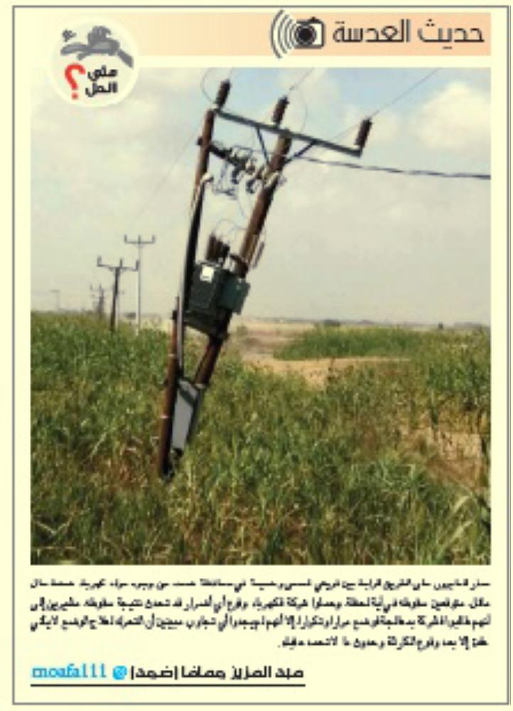 وكانت «عكاظ» نشرت في زاوية حديث العدسة، صورة العمود المائل ومخاوف الأهالي من الخطر الذي يتهددهم منه، في حال سقوطه، مشيرين إلى أنهم طالبوا الشركة بمعالجة الوضع مرارا وتكرارا، إلا أنهم لم يجدوا أي تجاوب، مبينين أن التحرك لعلاج الوضع لا يأتي عادة إلا بعد وقوع الكارثة، وحدوث ما لا تحمد عقباه.