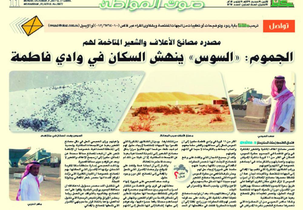 وكانت «عكاظ» نقلت شكوى سكان وادي فاطمة من انتشار حشرة السوس في أكثر من 11 قرية على طريق بحرة ــ الجموم ــ الطائف، ناشرة الأمراض بينهم، وإصابتهم بتقرحات في أجسادهم.
