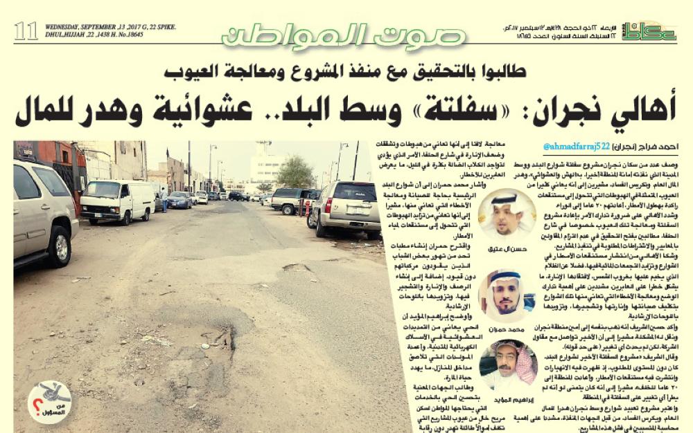 وكانت «عكاظ» نقلت شكوى سكان نجران من تهالك الطرق وسط المدينة وافتقادها للسفلتة، مشيرين إلى أنها أتلفت مركباتهم، مطالبين بمحاسبة المقصرين في أداء عملهم وتسببهم في هدر المال العام.