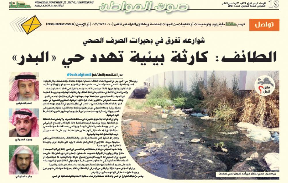 وذكرت الشركة تعقيبا على ما نشرته «عكاظ» بعنوان «الطائف: كارثة بيئية تهدد حي «البدر» في (4/3/1439) أنها أرست بعض المشاريع من بينها خطوط الصرف الصحي الرئيسية بالحوية، والبعض الآخر تحت إجراءات الطرح حالياً وسيتم طرح بقية المشاريع وفقا للخطط والاعتمادات».