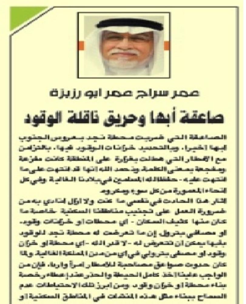 وكان أبو رزيزة كتب مقالا طالب فيه بإبعاد المحطات أو خزانات الوقود أو مصافي البترول عن التجمعات السكنية، مستذكرا الصاعقة التي ضربت محطة وقود في أبها، وأشعلت الحرائق في الموقع.