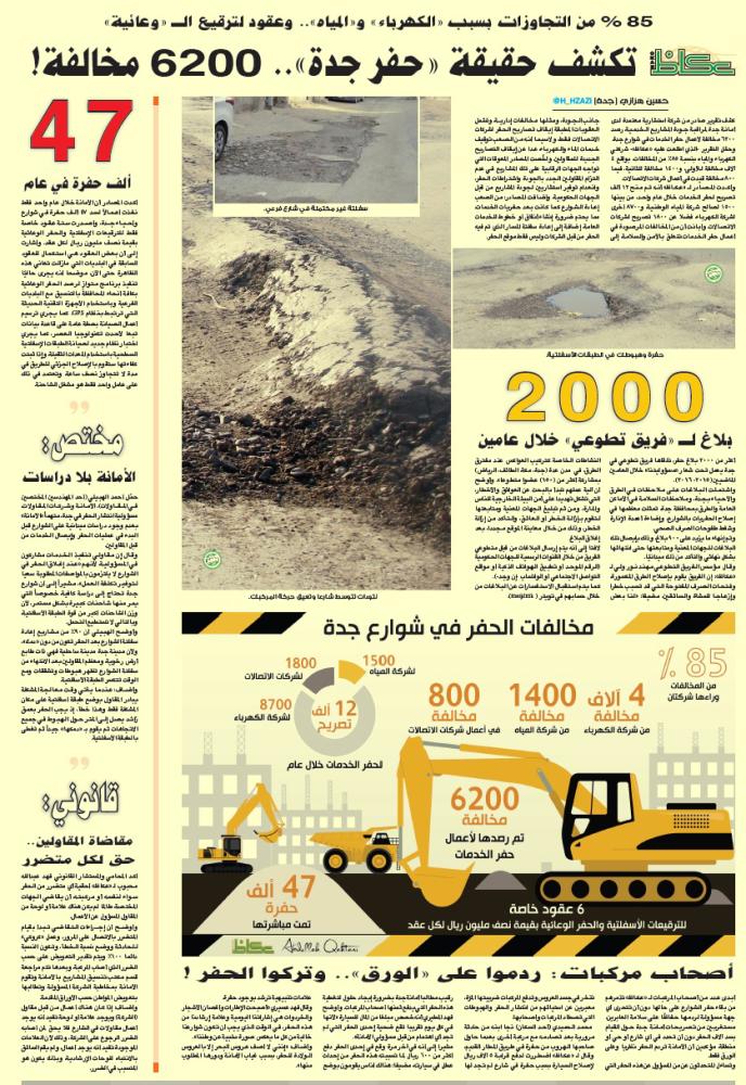 وكانت «عكاظ» نشرت تقريرا صادرا من شركة استشارية معتمدة لدى أمانة جدة لمراقبة جودة المشاريع الخدمية، رصد 6200 مخالفة لأعمال حفر الخدمات في شوارع جدة.