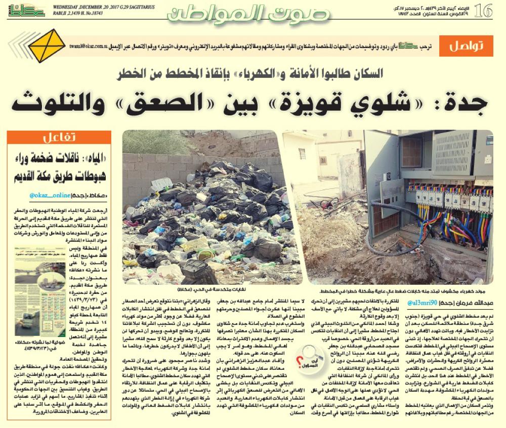 وكانت «عكاظ» نشرت تقريرا حول انتشار النفايات في شوارع مخطط الشلوي في حي قويزة، مصدرة التلوث والروائح الكريهة في الحي، فضلا عن وجود مولدات الضغط العالي المكشوفة التي تهدد العابرين خصوصا الصغار بالصعق الكهربائي.