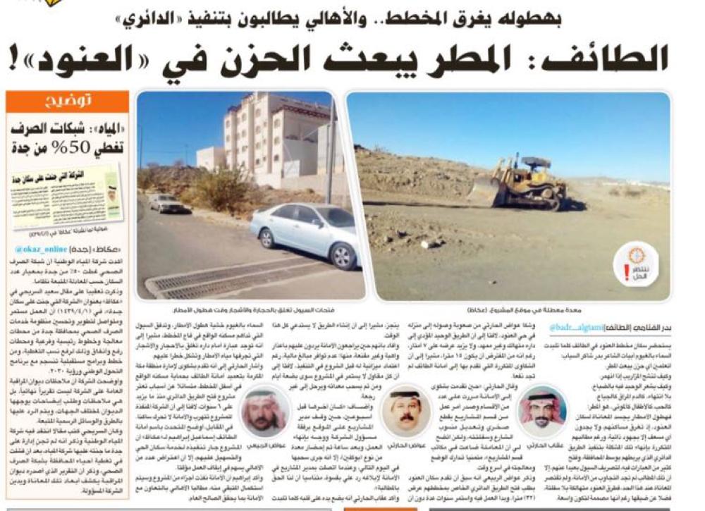 وكان أمين الطائف تفاعل مع «عكاظ» للمرة الثانية، ووقف على مجرى السيل الذي يهدد سكان حي الساير في الحوية (شمال المحافظة) استجابة لما نشرته بعنوان «مستثمر استولى على مجرى السيل ويهدد الساير» في (17/1/1439).