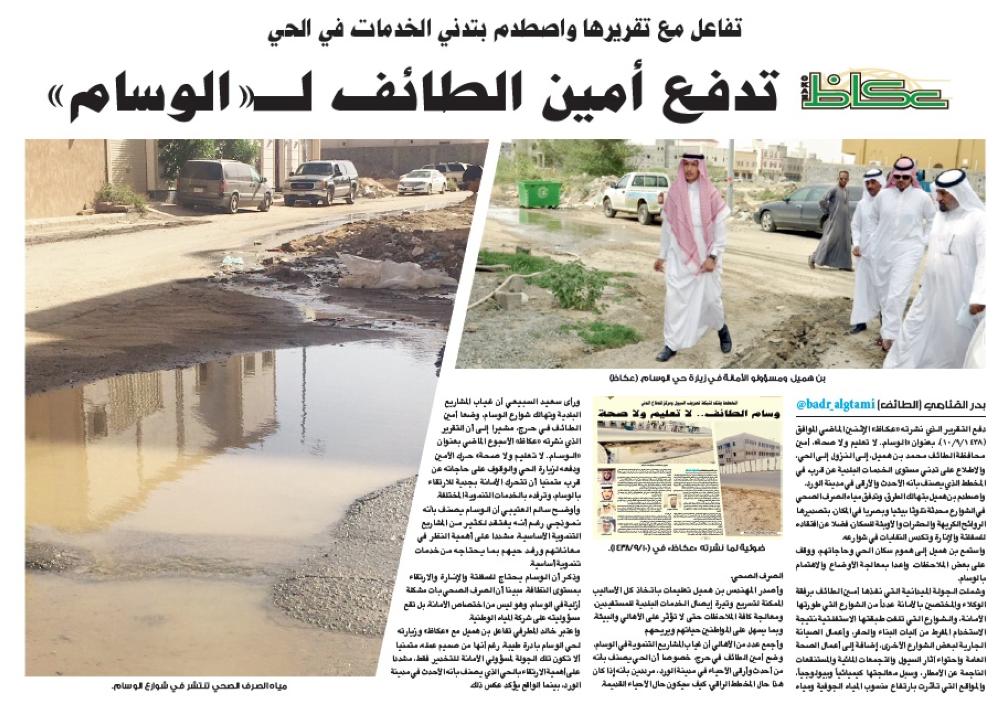 ويأتي تفاعل أمين الطائف مع «عكاظ» أمس ميدانياً للمرة الثالثة، بعد أن استجاب في المرة الأولى لمناشدة سكان حي الوسام عبر تقرير نشرته الصحيفة في (10/9/1438)، بعنوان «الوسام لا تعليم ولا صحة» شكوا فيه من تدني مستوى الخدمات البلدية.