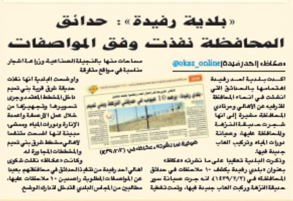 وذكر المجلس البلدي تعقيبا على ما نشرته «عكاظ» بعنوان «بلدية رفيدة: حدائق المحافظة نفذت وفق المواصفات» في (17/4/1439)، أنه وقف على الحدائق وفق محضر رقم 27 وقراره رقم 2، وحصر ملاحظاته عليها، في خطاب وجهه إلى البلدية برقم 179 في (27/8/1438)، مطالبا بلجان متخصصة في التحقيق في الهدر المالي السابق والحالي، المثبتة بالحقائق لدى المجلس البلدي.