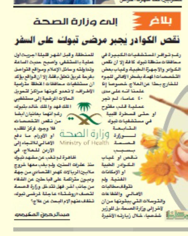 وذكرت صحة تبوك تعقيبا على ما نشرته «عكاظ» بعنوان «إلى وزارة الصحة نقص الكوادر يجبر مرضى تبوك على السفر»، في (30/4/1439) أن الخدمات الصحية في منطقة تبوك تقدم من خلال مجمع الملك عبدالله الطبي الذي يضم مستشفى الملك فهد التخصصي سعة 500 سرير ومجمع الأمل للصحة النفسية سعة 200 سرير وكذلك 10 مستشفيات موزعة في تبوك ومحافظات المنطقة بسعة سريرية إجمالية بلغت قرابة 2000 سرير.