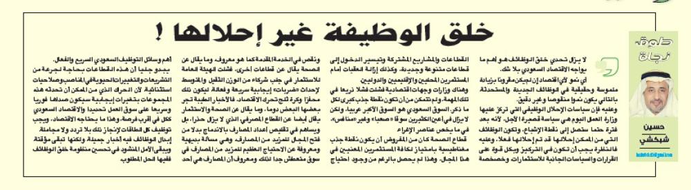 وكانت «عكاظ» نشرت مقالا لحسين شبكشي ذكر فيه أن تحدي خلق الوظائف هو أهم ما يواجه الاقتصاد السعودي، مطالبا بالتركيز على القرارات والسياسات الجاذبة للاستثمارات، وخصخصة القطاعات والمشاريع المشتركة وتيسير الدخول إلى قطاعات متنوعة وجديدة، وكذلك إزالة العقبات أمام المستثمرين المحليين والإقليميين والدوليين.