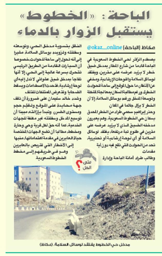 ووعدت الأمانة تعقيبا على ما نشرته «عكاظ» بعنوان «حي الخطوط يستقبل الزوار بالدماء» في (25/6/1439) بالارتقاء بالحي وتزويده بما يحتاجه من الخدمات التنموية. وكانت «عكاظ» نشرت شكوى الأهالي من تهالك مدخل الحي وافتقاده وسائل السلامة، ما حوله إلى ساحة للحوادث القاتلة.