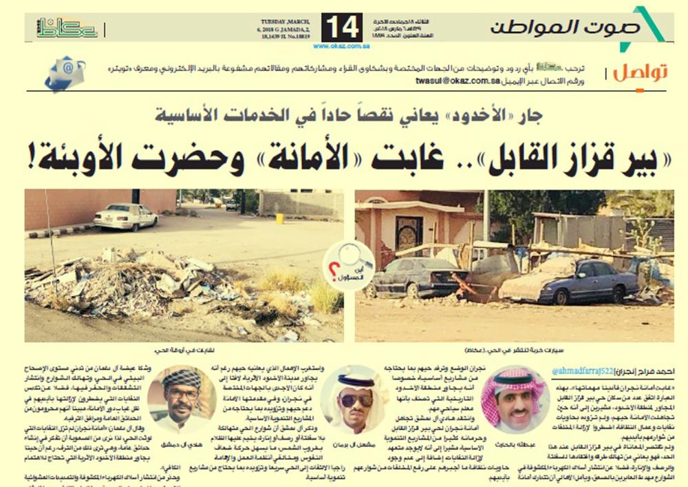 وكانت «عكاظ» نشرت تقريرا حول شكوى سكان حي بير قزاز القابل، من نقص حاد في الخدمات التنموية الأساسية مثل الرصف والإنارة والسفلتة، فضلا عن تدني مستوى الإصحاح البيئي، وتكدس النفايات في الشوارع، مطالبين بالالتفات إلى الحي، ورفده بما يحتاجه من المشاريع.