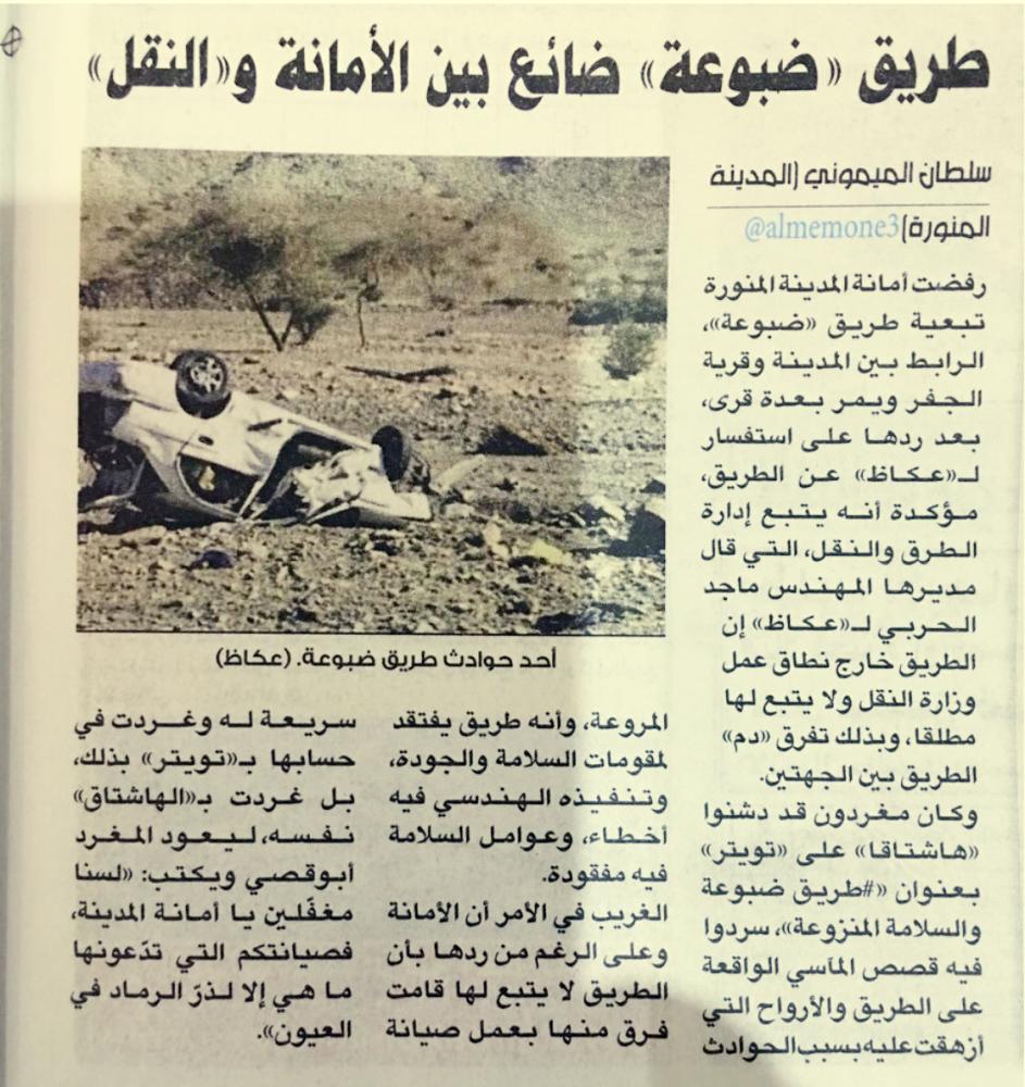 وكانت «عكاظ» نشرت تقريرا نقلت فيه رفض أمانة المدينة المنورة تبعية الطريق، مشيرة إلى أنه يتبع وزارة النقل، بينما ردت الأخيرة أن الطريق خارج نطاق عمل وزارة النقل ولا يتبع لها.