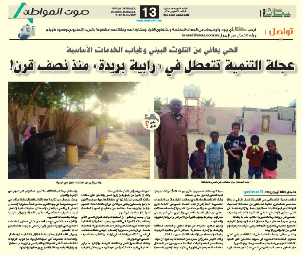 وكانت «عكاظ» نقلت معاناة سكان حي الرابية (شمال شرقي بريدة) من نقص حاد في المشاريع التنموية الأساسية، مثل تهالك الطرق وافتقادها للسفلتة والرصف والإنارة، فضلاً عن تكدس النفايات وانتشار المستنقعات في أروقته وتحولها إلى بؤر للأوبئة والحشرات والروائح، مطالبين أمانة القصيم بالالتفات إلى الحي ودعمه بالمشاريع التنموية الأساسية.