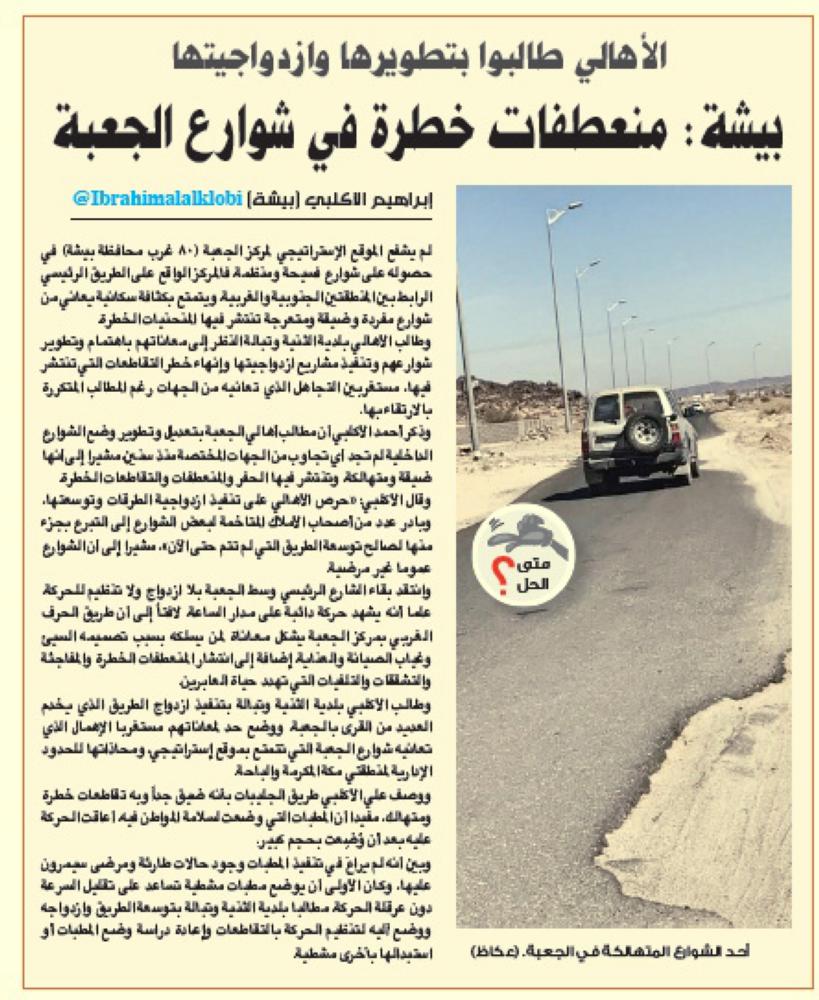 وكانت «عكاظ» نقلت شكوى أهالي مركز الجعبة من تهالك طرقهم وضيقها، وافتقادها للسفلتة والرصف والصيانة والازدواجية، مطالبين الجهات المختصة بالنظر إليها باهتمام.