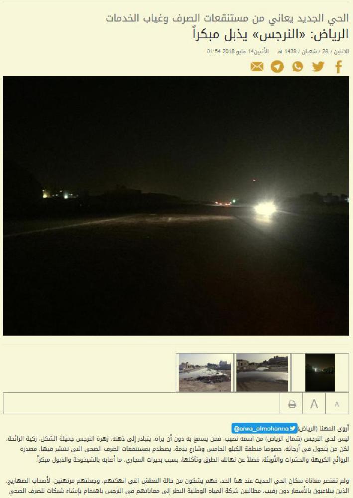 وكانت «عكاظ» نشرت شكوى سكان النرجس من نقص حاد في الخدمات التنموية، وانتشار مستنقعات الصرف الصحي في شوارعه وتحولها إلى بؤر لتصدير الأوبئة والروائح الكريهة والحشرات، فضلا عن تهالك الطرق وتآكلها بسبب بحيرات المجاري، إضافة إلى حالة العطش التي يعانيها السكان، ما جعلهم مرتهنين لأصحاب الصهاريج.