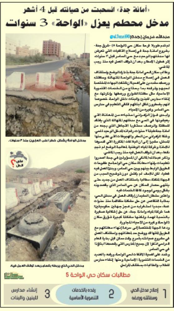 وكان عدد من سكان حي الواحة شكوا لـ«عكاظ» توقف أمانة جدة في رجب الماضي عن استكمال مشروع إصلاح التلفيات التي تعرض لها مدخلهم الوحيد مع حي السامر قبل 3 سنوات، إثر هطول الأمطار، مطالبين بتدارك الوضع واستئناف العمل في إصلاح مدخل الواحة المتهالك وسفلتته ورصفه، مشددين على أهمية أن تلتفت الجهات المختصة لحيهم وترفده بما يحتاج من الخدمات التنموية الأساسية.