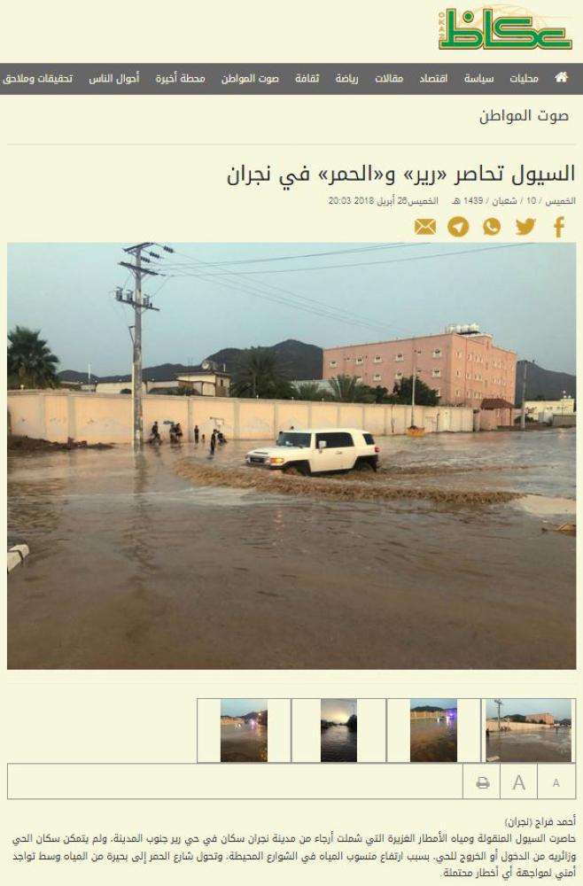 وكانت «عكاظ» نشرت تقريرا حول محاصرة السيول المنقولة ومياه الأمطار الغزيرة حي رير جنوب نجران وتحول شارع الحمر إلى بحيرة، أعاقت حركة العابرين، وحاصرت السكان في مساكنهم.