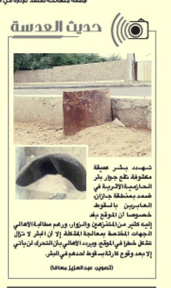 تفاعل محافظ ضمد بالنيابة سمير بن مسفر الغامدي مع ما نشرته «عكاظ» في زاوية حديث العدسة، حول بئر مكشوفة تشكل خطرا على العابرين جوار بئر الحازمية الأثرية في ضمد بجازان، وأصدر تعليمات للدفاع المدني بإغلاقها فورا، بعد أن تزايدت شكاوى الأهالي من خطرها. وتحرك رجال الدفاع المدني على الفور، وأغلقوا البئر بإحكام، وإزالة الخطر الذي ظل يتهدد العابرين فترة طويلة. وكانت «عكاظ» نشرت في عددها الصادر يوم (29/‏12/‏1439) صورا لبئر عميقة ومكشوفة تقع جوار بئر الحازمية الأثرية بضمد بمنطقة جازان تهدد السكان والزوار بالسقوط، خصوصا أنها تقع في منطقة تحظى بإقبال كثيف من المتنزهين من مختلف الأعمار. وشكر الأهالي محافظ ضمد بالنيابة ورجال الدفاع المدني نظير تفاعلهم السريع، وإزالة الخطر الذي كان يتهددهم فترة من الزمن.