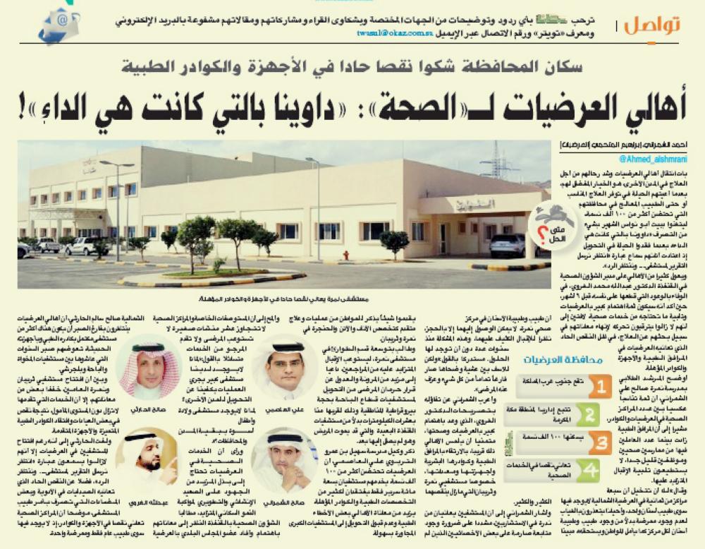وعد مدير الشؤون الصحية بالقنفذة الدكتورعبدالله الغروي بدعم محافظة العرضيات بكادر طبي بعد الانتهاء من أعمال لجنة التعاقد الخارجي، مؤكدا أنه زار محافظة العرضيات مرات عدة، للوقوف على العمل الصحي بها ومتابعته. وذكر الغروي تعقيبا على ما نشرته «عكاظ» بعنوان «أهالي العرضيات لـ «الصحة»: «داوينا بالتي كانت هي الداء» في (7/1/1440) أنه يوجد في العرضيات مستشفيان بسعة 50 سريرا و17 مركزا صحيا، لافتا إلى أنه عقد لقاء بالأهالي للاستماع إلى مطالبهم ورصد ملاحظاتهم. وأعلن الغروي افتتاح عيادة للمسالك البولية وأخرى للعيون بثريبان، واعدا بافتتاح العمليات قريبا وتأمين جهاز الأشعة. وكشف عن اتفاقية مع جمعية زمزم لزيارة الأطباء في بعض التخصصات الطبية لمستشفى نمرة وإقامة قافلة طبية تخصصية. وكانت «عكاظ» نشرت تقريرا حول شكوى سكان العرضيات من تدني مستوى الخدمات الصحية، مشيرين إلى أن النقص الحاد الذي تعانيه محافظتهم في الأجهزة والكوادر الطبية دفعهم للسفر لتلقي العلاج في المناطق البعيدة، رغم مخاطر الطريق وآلام المرض.