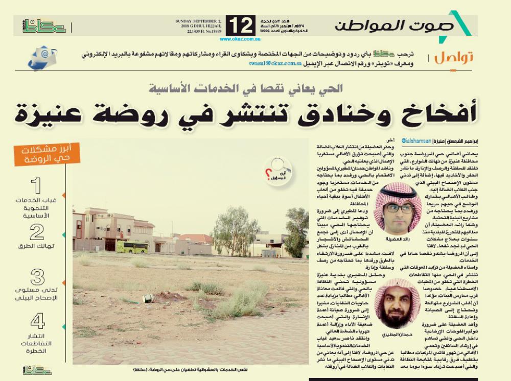 وكانت «عكاظ» نقلت شكوى سكان حي الروضة جنوب عنيزة من تهالك الشوارع، التي تفتقد السفلتة والرصف والإنارة، ما نشر الحفر والأخاديد فيها، إضافة إلى تدني مستوى الإصحاح البيئي الذي جذب الكلاب الضالة إليه، مطالبين بتدارك الوضع في حيهم سريعا ورفده بما يحتاجه من مشاريع البنية التحتية.