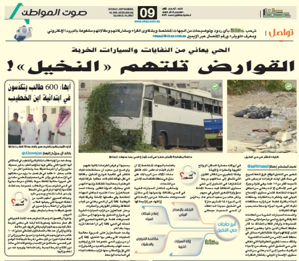 وكانت «عكاظ» نقلت شكوى سكان حي النخيل من تدني مستوى النظافة وتزايد تسريبات شبكة المياه، ما نشر المستنقعات في الحي، متحولة إلى مصدر للأوبئة والحشرات والروائح الكريهة.