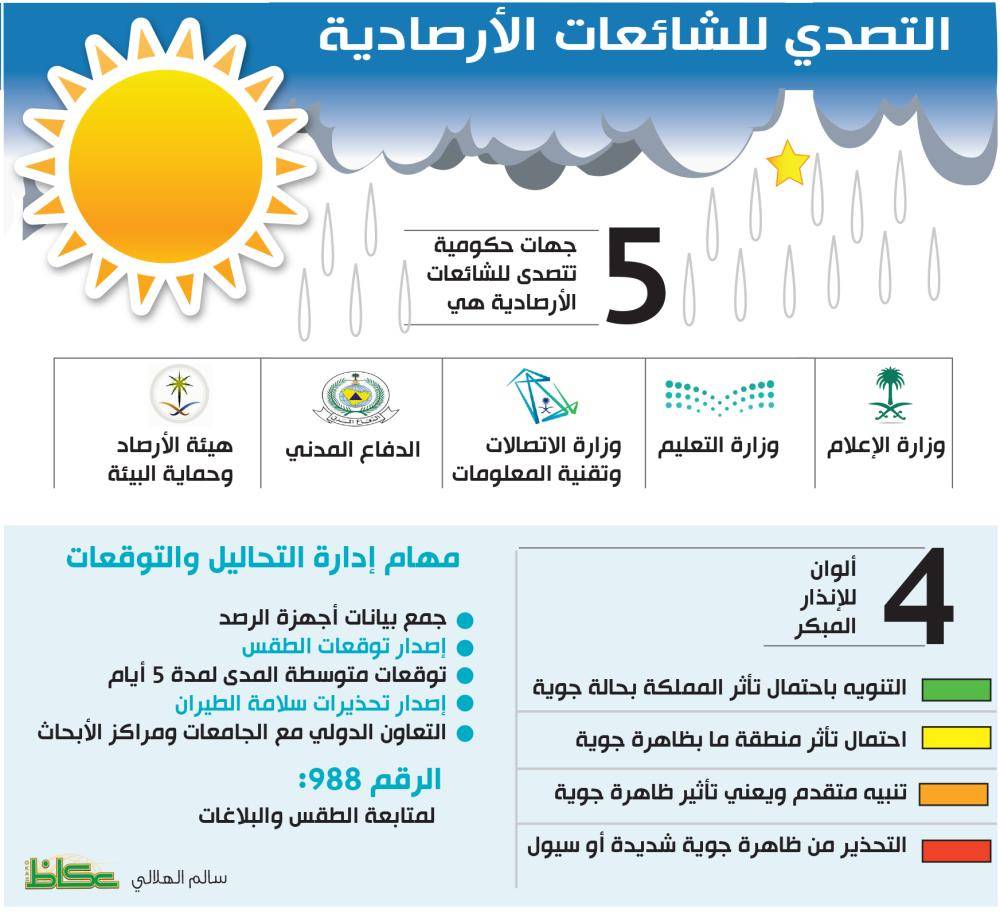 وسعدت جداً بالخبر الذي نشرته وسائل الإعلام قبل أيام ومفاده أن خمس جهات حكومية وهي وزارات الإعلام، التعليم، الاتصالات وتقنية المعلومات، والداخلية ممثلة في الدفاع المدني، وهيئة الأرصاد وحماية البيئة، عقدت اجتماعها الأول لوضع آلية التصدي للشائعات الأرصادية عبر المواقع الإلكترونية والحسابات في منصات التواصل الاجتماعي التي تؤدي إلى التشويش الذي يتعرض له الجمهور في تلقيه للمعلومات الأرصادية من قبل بعض الحسابات التي تنشر معلومات مغلوطة، وتدلي بقراءات غير علمية للظواهر الجوية على المملكة، واتفق المجتمعون على آلية عمل تشمل التنظيم من خلال الاستفادة من القوانين والتشريعات للجهات، وتم تنفيذ فريق تنفيذي من الجهات المختصة لوضع خطة عمل تساهم في الحد من هذه الظاهرة وتحقيق الهدف المنشود لوصول معلومات الطقس للمجتمع من مصدرها الرسمي.