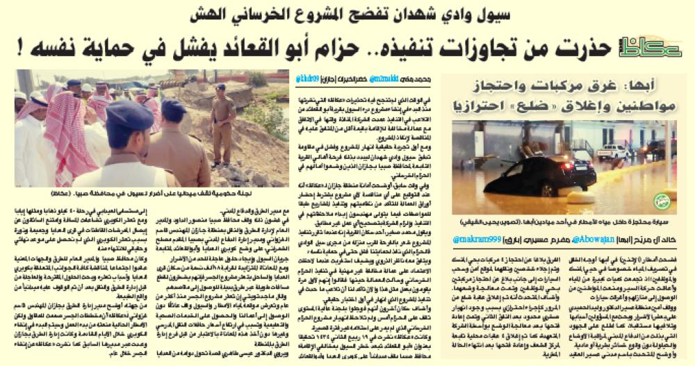 وكانت «عكاظ» نشرت تقريرا نقلت فيه تحذيرات الأهالي من التلاعب في تنفيذ مشروع درء السيول في قرية أبو القعايد، مشيرين إلى أن الشركة المنفذة اتفقت مع عمالة مخالفة للإقامة بقيمة أقل من المتفق عليه في المناقصة لإنفاذ المشروع.