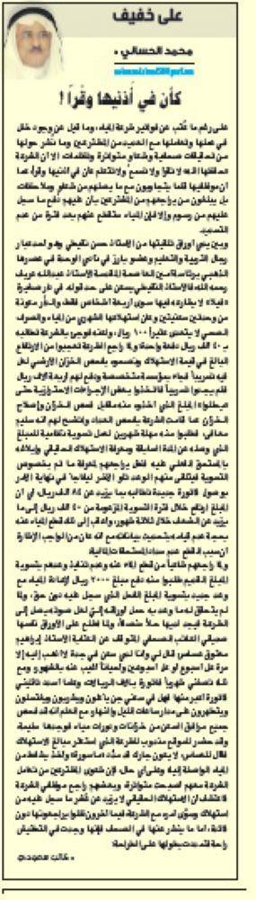 وبينت أن العميل تقدم بشكوى لشركة المياه الوطنية في جدة بتاريخ (12/ 11/ 2018) وجرى استبدال عداده بآخر حسب الإجراءات الداخلية المتبعة في الشركة في مثل هذه الحالات، وتستغرق دراسة ومتابعة الاستهلاك للعداد الجديد المستبدل (3) قراءات في دوريات ضخ، وسيتم بعدها إفادة العميل بتاريخ الدراسة والمتابعة الدقيقة. وكان الحساني كتب مقالاً انتقد فيه ما اعتبره تجاهل شركة المياه الوطنية لشكاوى المستهلكين من ارتفاع الفواتير، لافتاً إلى أن موظفيها قلما يتجاوبون مع ما يصلهم من شكاوى وملاحظات، بل يبلغون من يراجعهم من المشتركين بأن عليهم دفع ما سجل عليهم من رسوم وإلا فإن المياه ستقطع عنهم بعد فترة من عدم التسديد.