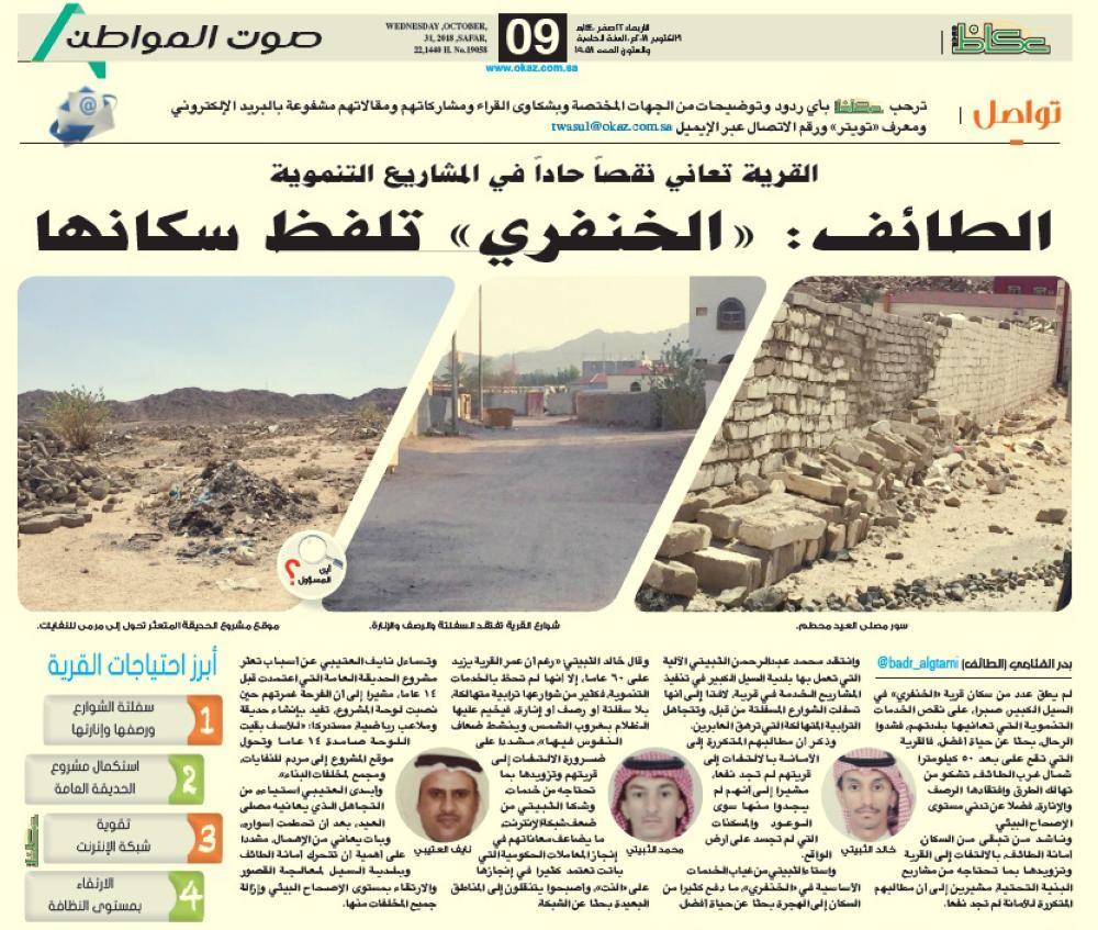 ووعدت الأمانة ردا على ما نشرته «عكاظ» بعنوان «الطائف: الخنفري تلفظ سكانها» في (22/2/1440) بتنفيذ تلك المشاريع في المستقبل القريب.