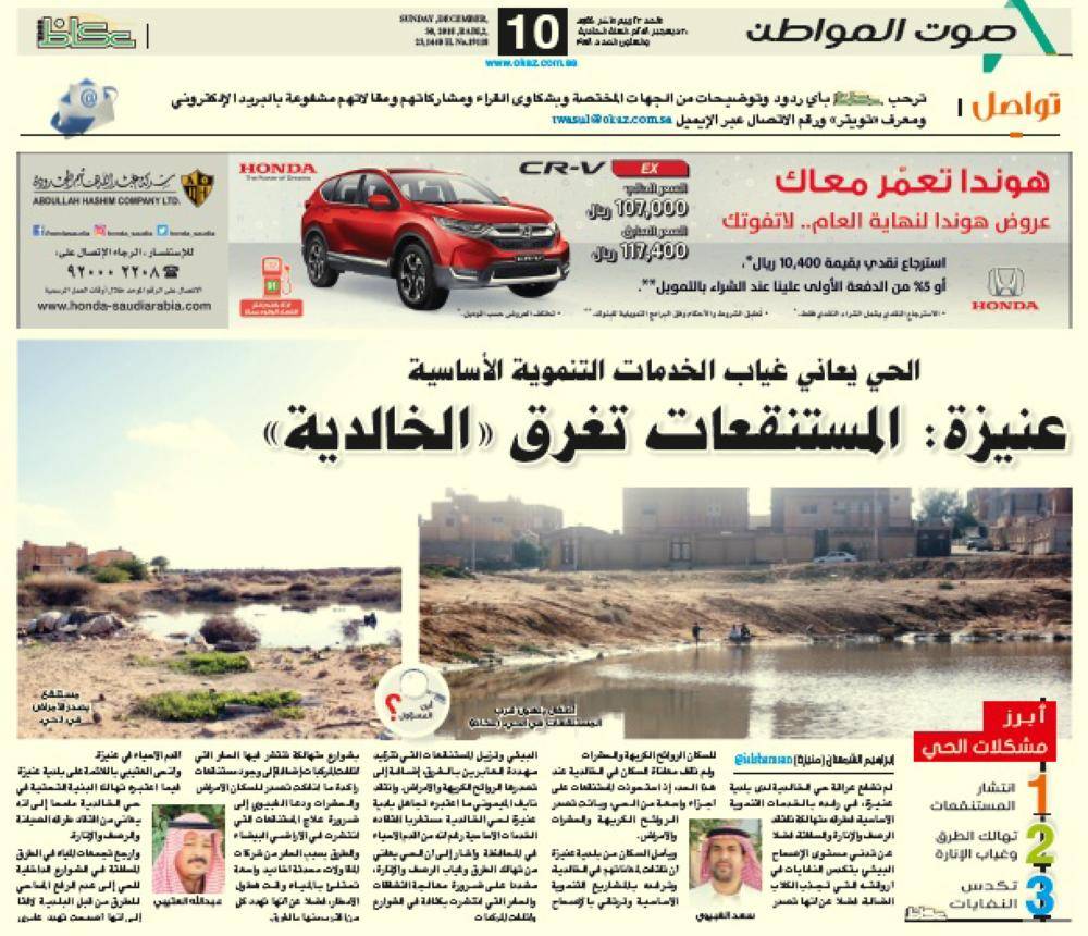 ونفت البلدية، تعقيبا على ما نشرته «عكاظ» بعنوان «عنيزة: المستنقعات تغرق الخالدية» (23/4/1440)، تدني مستوى الإصحاح البيئي في الحي، مؤكدة أن فرقها ترفع النفايات يوميا دون انقطاع لجميع أحياء عنيزة، ومنها حي الخالدية.