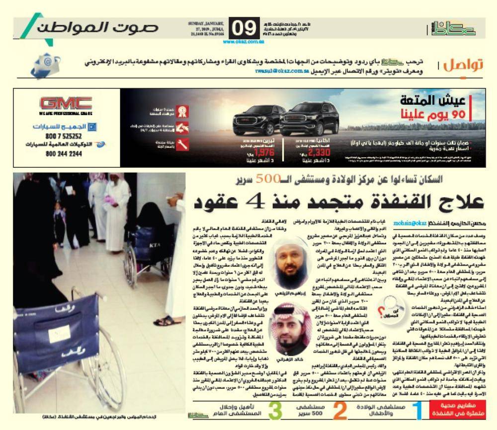 وكانت «عكاظ» نشرت تقريرا نقلت فيه شكوى سكان القنفذة من تدهور الخدمات الصحية في محافظتهم، مشيرين إلى أن الجمود أصابها منذ 40 عاما ولم تواكب النمو السكاني الذي شهدته القنفذة طيلة هذه السنين، متسائلين عن مصير مشروعي مستشفى الولادة والأطفال الذي أقر بـ200 سرير، والمستشفى العام سعة 500 سرير، بعد أن تناهى إلى مسامعهم أنباء عن سحب الاعتماد المالي وإلغاء المشروعين، لافتين إلى أن معاناة المرضى في القنفذة تتضاعف بفعل آلام المرض، ووعثاء السفر بحثا عن العلاج في المدن البعيدة.