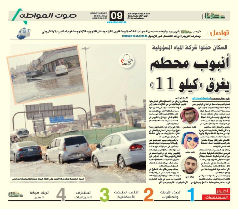 وذكرت «المياه» تعقيبا على ما نشرته «عكاظ» بعنوان «أنبوب محطم يغرق كيلو 11» في (14/5/1440) أنه جرى عزل المياه عن المنطقة وإصلاح مصدر التسرب وتم توجيه الصهاريج لسحب المياه المتجمعة في الموقع، مشيرة إلى أن الخط يقع في منطقة ذات ضغوط عالية ومواقع خطوط رئيسية. وكانت «عكاظ» نشرت تقريرا نقلت فيه شكوى سكان كيلو 11 في حي المنتزهات الشرقي من تحطم أنبوب مياه، أغرق الشارع الرئيسي وأعاق حركة المركبات، فضلا عن تسببه في تشكيل مستنقعات واسعة تنفث الروائح الكريهة والحشرات للسكان، مطالبين بتدارك الأمر وإصلاح الشبكة التي تتحطم من حين لآخر على حد قولهم.
