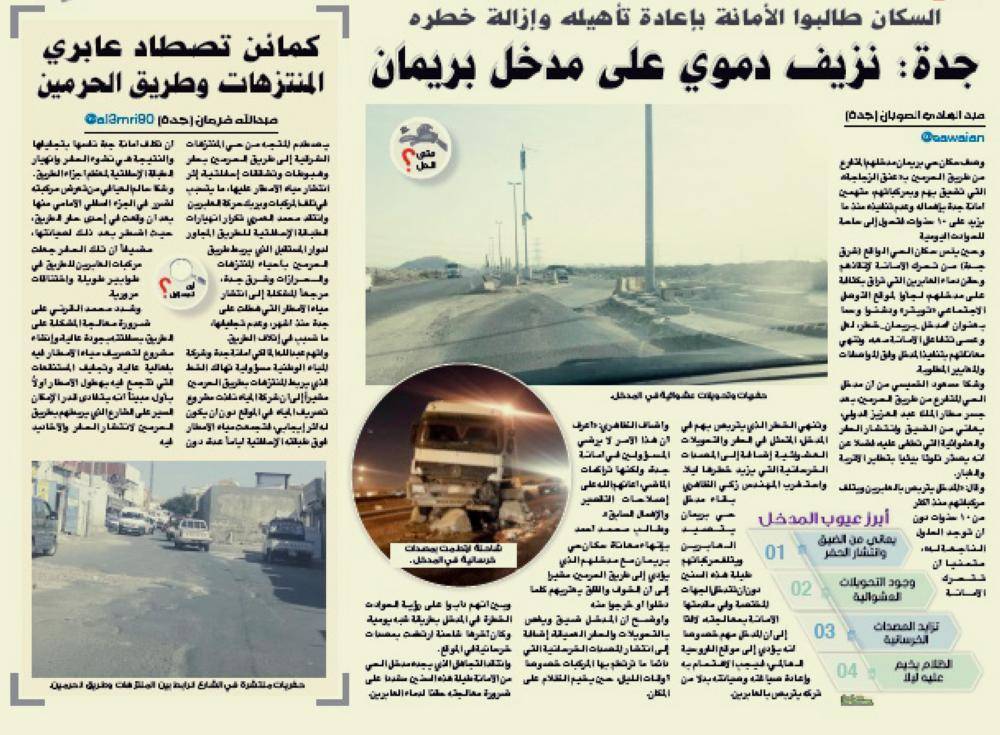 وكانت «عكاظ» نشرت تقريرا نقلت فيه شكوى سكان حي بريمان من إرباك حركة السير في مدخلهم المتفرع من طريق الحرمين، واصفينه بـ«عنق الزجاجة»، الذي يضيق بهم وبمركباتهم، متهمين أمانة جدة بإهماله وعدم تنفيذه منذ ما يزيد على 10 سنوات، فتحول إلى ساحة للحوادث اليومية.