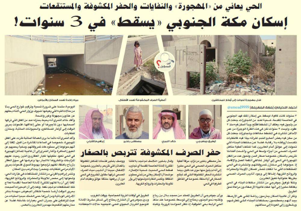 وكانت «عكاظ» نشرت تقريرا نقلت فيه شكوى أهالي حي إسكان الملك فهد الجنوبي في العاصمة المقدسة، من تدني مستوى الخدمات في حيهم، وتكدس النفايات ومخلفات البناء، إضافة إلى اختفاء أغطية مناهل الصرف الصحي من أجزاء واسعة في الحي، وأضحت أفخاخا تتربص بالسكان، خصوصا صغار السن. وتحول عدد من الفلل المهجورة في الحي إلى أوكار لمخالفي أنظمة العمل والإقامة.